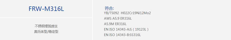 配合焊劑FRW-300、FRW-107焊劑使用,低碳18%Cr-12%Ni-2%Mo不銹鋼焊接用(SUS316等),焊接性優良,抗裂紋敏感性及耐腐蝕能佳。